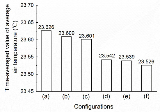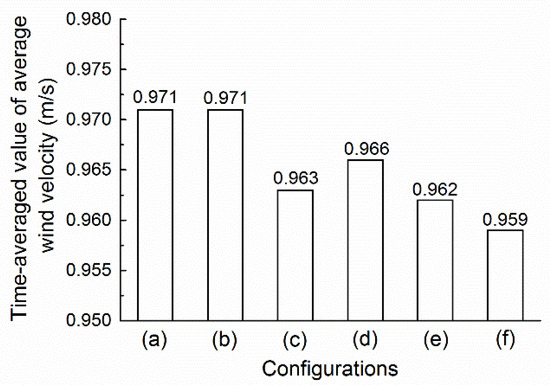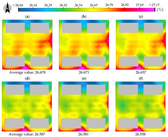 The time-averaged average air temperatures for each configuration were obtained by averaging the average air temperature values at nine time points from 08:00 to 16:00 (see Figure 8). For the middle- and low-level plant collocations, the value in Figure 8c was the lowest, and was 0.025 °C and 0.008 °C lower than those in Figure 8a,b, respectively. For the middle- and high-level plant collocations, the time-averaged average air temperature in Figure 8f was the lowest, and was 0.016 °C and 0.013 °C lower than those in Figure 8d,e, respectively.