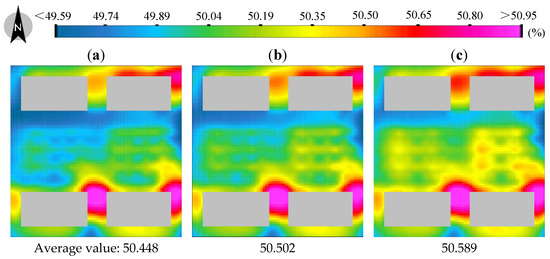 Figure 9 shows the changes in relative humidity for the two plant collocations under different ratios of trees to shrubs (1.5 m above ground, 15:00). In the underground space development area, the values of relative humidity in Figure 9a–c were clearly lower than those in Figure 9d–f. The change in relative humidity from the average relative humidity was in the range of 0.428~0.504% for the two plant collocations under the same ratio of trees to shrubs.