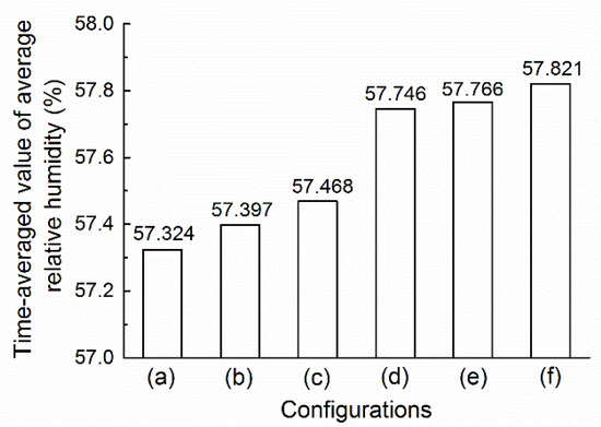 Time-averaged value of the average relative humidity for each configuration. (a–c) were middle- and low-level plant collocations corresponding to tree to shrub ratios of 2:3, 1:2, and 1:3; (d–f) were middle- and high-level plant collocations corresponding to tree to shrub ratios of 2:3, 1:2, and 1:3 (picture source: Author self-drawing).