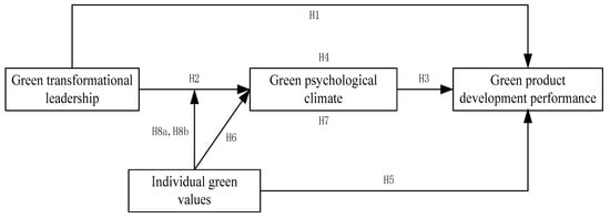 When green products are more popular in the market, green product development becomes more prevalent [6,10]. Different than traditional product development, green products more extensively consider environmental impacts by focusing on the life cycle of the product, mining the subsequent use of the products and recognizing the social environment of the whole product supply chain [11]. Green product development plays an important role in determining the sales of green products. This development process not only changes company management models, but also reshapes market rules [12]. However, many companies remain stuck in the stage of recognizing the product management model as “pollution-governance”. They neglect the fact that the reform of companies requires a new kind of leadership—green transformational leadership. Although some studies have found that green transformational leadership has a significantly positive impact on green product development performance [6], the role of leaders was mainly discussed. In fact, prior literature has widely identified that the performance of companies is due to the interactive relations between leaders and their employees [13]. For instance, Kim et al. found that transformational leadership could facilitate the linkage between employee core self-evaluation and employee outcomes [14]. Therefore, in this study, we aimed to fill the research gap by analyzing the effects of green transformational leadership and individual green values. Moreover, a recent study from Jabbour et al. examined 62 Brazilian companies and found that the relations between human and organizational aspects to green product development was not significant [9]. However, prior studies have shown that human aspects like sustainable organizational climate [15] and employee dedication [16] could support environmental management. Thus, this study would like to further explore this problem.