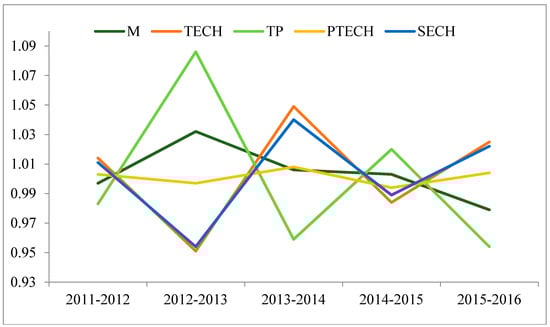 As shown in Figure 1, the efficiency change indexes for the 2011–2012 period, the 2012–2013 period, the 2013–2014 period, the 2014–2015 period and the 2015–2016 period were respectively 1.014, 0.951, 1.049, 0.984 and 1.025. From the dynamic change, the efficiency first decreased, then increased, then decreased and finally increased, showing a fluctuating trend. The changing trend of pure technical efficiency was the same as that of scale efficiency. The pure technical efficiency also first decreased, then increased, then decreased and finally increased.