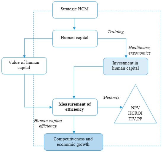At present, if enterprises strive for being successful, it is a high time for them to move the item of human capital to the right side—the side of assets. The perception of human capital as an asset that can provide the profit in the future is the focal idea for the maintaining of competitiveness. To be able to increase their performance and competitiveness in the market it is required for the organizations to invest in human capital and to measure its effectiveness in two aspects (the effectiveness of the utilization of HC and the effectiveness of investment in HC) within the implementation of HCM (Figure 1).