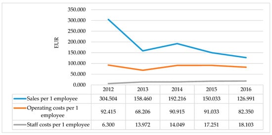 The sales, operating and staff costs per 1 employee (EUR). Source: profit and loss statements of the enterprise between 2012 and 2016, own processing.