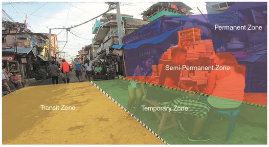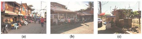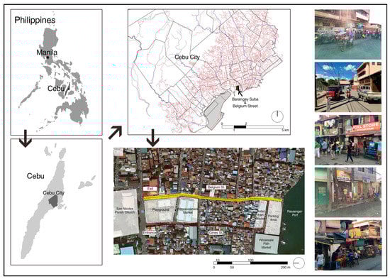 In developed urban environments such as cities, public spaces are recognized as elements that contribute towards sustainable development [,]. Streets are public spaces that function as the city’s vital organs [] that act as paths which improve the connectivity of the city with other environmental elements []. They promote social sustainability by improving community engagement [], and giving people opportunities to interact with one another, play, and relax [,,]. In addition, streets function as centers that promote commercial activity [] and provide a means of active travel for health and well-being []. Culturally, streets in Southeast Asia mentioned by Oranratmanee and Sachakul (2014, p. 213) were described by scholars as “lively” compared to those of western streets []. In the past, first world countries have used streets for the main purpose of vehicular traffic, while third world countries have already used streets as public spaces that served areas with dense populations, and were used to make up for the lack of open spaces []. Streets in the Philippines share some similarities with those of other Southeast Asian countries in terms of appearance and how they are used as public spaces; some minor streets in the Philippines were described by Dela Paz (2009, p.97) as having a “tightness of the right-of-way” emphasized by their lack of sidewalks and residences with no setbacks while accommodating two lanes for vehicular circulation, but are still utilized by people for their activities []. This utilization of street space can be explained by how Filipinos perceive their use of public space. Filipinos use public spaces in such a way that they become the user’s private property at the time of their use []. This is further explained by Mojares (1999, p. 124) in the description of the Filipino’s concept of space as “malleable, negotiable and loosely bounded”, which is caused by the lack of usage of physical boundaries around houses such as fences and occupation of sidewalks for squatting and vending []. In addition, negotiable behavior regarding vehicular traffic can be seen on these streets, as drivers of Jeepneys (a means of public transportation in the Philippines) try to negotiate with each other for space []. Despite how Filipinos use streets, their development in the Philippines has begun to evolve with the design of streets in developed countries. After the Second World War, the development of suburbs caused streets to become more private and controlled []. In addition, the establishment of commercial malls began to depersonalize streets as public spaces. These commercial malls acted as exclusive public spaces for those who can spend money on their facilities, thereby displacing vendors and those without money out onto streets, which has changed the perception of streets in the Philippines as chaotic places filled with crime [].