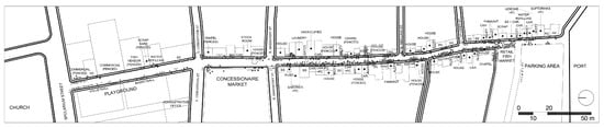 An investigation was conducted from 5–17 December 2017, over two weekdays and two weekends, to ensure consistency and to observe the stationary daily activities that occurred in the street. First, a base map was constructed which included the existing structures and the kinds of occupational use that the structures accommodated. Second, activities on the street were recorded on the base map using the method of Behavior Mapping []. Behavior mapping is a method wherein activities are recorded on a map to understand people’s behaviors through activities in relation to the existing buildings and spaces on a street. To get more information on these behaviors, activities were recorded at different times of the day, and used with other collected behavior maps by layering them one on top of the other to discover certain patterns, such as the location of different types of activities on the map, movement of activities at different times, and changes of activities throughout the day. In addition, this method required the author to stay in the area during data collection, wherein he was able to observe the current situation of the street. This gave the author the opportunity to understand people’s behaviors at a personal level and gather information that cannot be collected by the behavior mapping method alone, such as sounds, smells, and movement of vehicular traffic, making it an ideal method for studying behavior on the street. For this research, activities were recorded at 5 different time frames for both weekdays and weekends. Data collection occurred on the dates of 12th December (Friday) and 9th December (Saturday) in the hours from 4:00–5:00 and 20:00–21:00, and on the dates of 7th December (Thursday) and 17th December (Sunday) in the hours of 8:00–9:00, 13:00–14:00 and 16:00–17:00. The route for data collection passed through Belgium Street (Figure 3). The author began from Spolarium Street and walked towards the port area while recording all activities on one side. After reaching the port area, the author turned to walk back towards Spolarium Street along the opposite side of the street while recording the rest of the activities on the behavior maps (Figure 3).