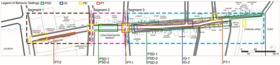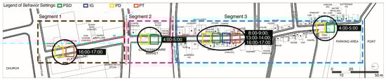 The next movement occurred at 16:00–17:00 when the markets were closed. At this time, people came home from work and school to take time to rest on the street. In addition, people during their free time would play sports on the playground along segment 1, which influenced behavior settings such as PD and PT-2. The people’s free time on the street influenced behavior settings such as PSD, IG, and PT-1 behavior settings along segment 3.