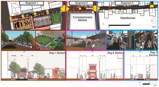 The first scheme applied the results of the analyses by focusing on improvements that preserve the activities based from the behavior settings on the street through street sharing (Figure 9). The street’s width was narrowed to properly set it as a one-way street to prioritize pedestrian over vehicles. Sidewalk elevations were leveled with the carriageway to enhance safety. In addition, the semi-permanent and temporary zones from the analysis were merged together with widened sidewalks, and used different colored pavements to emphasize the zones.