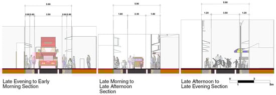 Similar to segment 2, time schedules were implemented along segment 3 in order accommodate the behavior settings along this part of the street. During the late evening and early morning, pedestrians occupy the pink area for walking, while the gray areas are allocated for activities from PSD and IG behavior settings. From the late morning until late afternoon, the carriageway reduces its width up to the white strips to accommodate both walking and small vehicles, such as tricycles, to pass through. Behavior settings can then accommodate both the gray and pink area, increasing the area of their activity. Lastly from late afternoon to late evening, the segment becomes closed to vehicles and people and students and coming home from work and school. The occupied areas for activities from PSD and IG behavior settings move back down to the pink area, and the carriageway becomes a playground for the PT-1 type and for pedestrians to walk on (Figure 10).