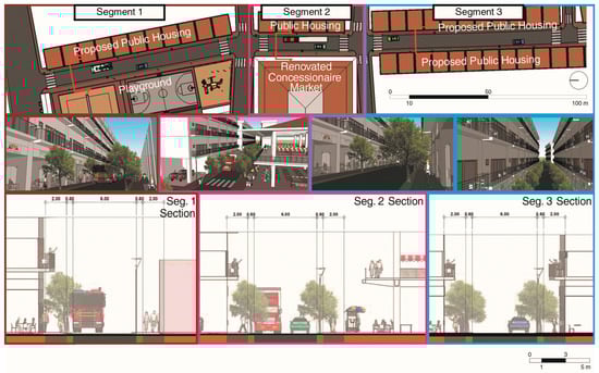 The second scheme focused on improving the street by widening the carriageway, providing new housing and market facilities, and relocating activities away from the street (Figure 11). The whole stretch of Belgium Street was uniformly widened to accommodate two lanes for vehicles, by taking back some portions of private properties and converting the existing structures into multi-story public housing. The sidewalks were separated from the carriageway using plant strips to protect pedestrians against higher traffic speeds. The street can only be used for vehicular traffic and pedestrian circulation activities such as walking, and all activities will be relocated inside the ground floor of the proposed public housing buildings and in the renovated fish markets.