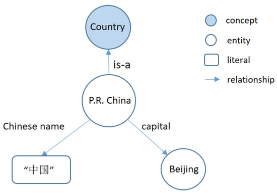 Beijing”. All these relationships and their related entities, concepts or literals are stored in the form of triples in knowledge graphs which is the basic storage unit of knowledge graphs. Triples organize knowledge in the form of <subject, predicate, object>, e.g., <P.R. China, is-a, Country> and <P.R. China, Chinese name, “中国”>.