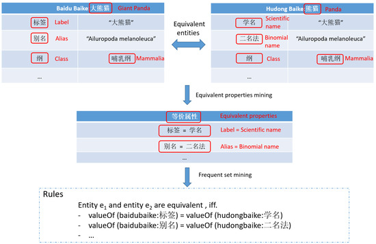 owl:sameAs, as well as their properties, are used as seeds to discover more equivalent entities. For each pair of existing equivalent entities, the method firstly tries to mine equivalent properties from them. Then frequent sets, each of which consists of several pairs of equivalent properties, are mined from these equivalent properties through association rule mining. The mined frequent equivalent property sets are used for building matching rules and applied on the whole data set to find new equivalent entities. For example, suppose we have a pair of equivalent entities (see