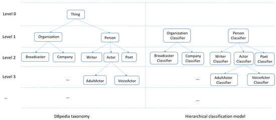 When using this model to predict types for a given entity, it traverses the DBpedia taxonomy in a top-down manner to search for types of this entity. It first visits the types in the first level of the taxonomy which are the sub-types of root node “Thing” and add them to the candidate types set. Then for each candidate type, the approach runs the classifier of the type to test whether the given entities belong to this type or not. If the result is true, it adds all its sub-types to the candidate type set. The process ends when no more candidate types can be processed. All types, which are classified as true for the given entity during this process, are attached to the entity as its types.