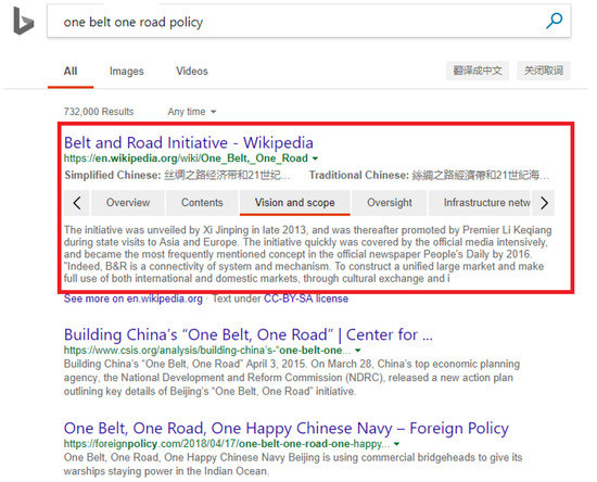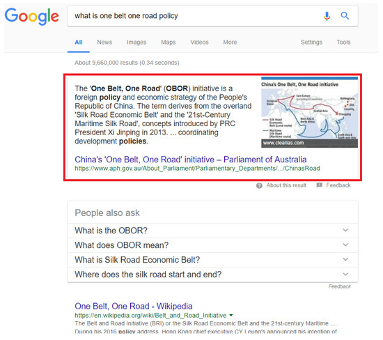 what is One Belt One Road policy” in Google, it will return the definition of OBOR in Google Knowledge Graph to users which can help users quickly know what OBOR is. In addition, knowledge graphs are very helpful to people who want to know more about OBOR but do not know what to search for. All relevant knowledge of OBOR which is integrated in the knowledge graph can be returned to users for reference. For example, when users search “