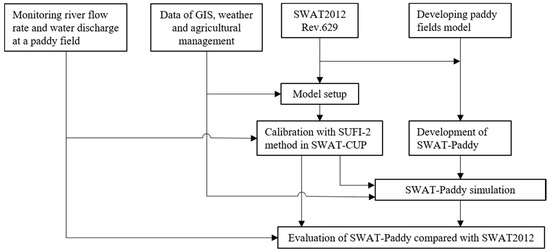 The goal of this study was to enhance paddy simulation by improving accuracy in watershed modeling using the SWAT model. As an objective of this research, to simulate paddy fields water management, SWAT2012 rev.629 was modified (1) to equip it with a new water balance model including water impoundments in paddy fields, (2) to add an irrigation management option for paddy fields that are characterized by flood irrigation, with target ponding depths managed on a daily basis, and (3) to account for the fact that puddling influences discharge water quality and infiltration rate during growing periods. The modified model was named SWAT-Paddy. To examine the model’s performance, SWAT-Paddy was applied to an actual watershed containing paddy fields in Japan. The workflow scheme of the research is shown in Figure 1.