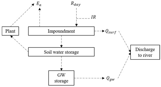 Hydrological processes in paddy fields are different from processes in other land uses, because water from rainfall and irrigation is stored above the ground as an impoundment during growth seasons [31]. To represent paddy impoundment in SWAT, a new module for impoundment was developed [21]. Water balance was calculated using: