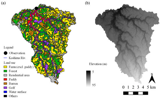 Maps of (a) land use distribution in the watershed and (b) topography of the watershed.