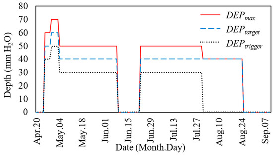 The demanded irrigation depth on a given day (IRdemand, mm H2O) was calculated using Equations (6) and (7).