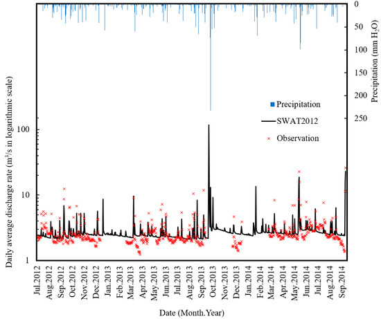The parameters required to compute the hydrologic cycle in this watershed were calibrated with daily river flow data, which was observed in the period between 2012 and 2014, using the SUFI-2 [53] method in SWAT-CUP. After seven iterations (one iteration equals 1500 simulations), we obtained the best parameter set (Table 4). In the SUFI-2 method, parameter sensitivity is determined by computing multiple regression systems [54]. In this process, we got the ranking of parameter sensitivities in the final iteration (Table 4). The p-value of each parameter obtained from the t-test shows that the sensitivity of ALPHA_BF is considerably significant. This means that the groundwater process in this watershed has a large impact on river flow compared to other processes. In addition, the value of ALPHA_BF is calibrated to a low value to represent the highly stable base flow of the Kashima River. Based on the results of the calibration, the watershed was characterized as being very flat, with groundwater discharge taking a very long time to reach river flow. Using the best parameter set gained in the calibration process, the Nash Sutcliffe model efficiency (NSE), Ratio of RMSE to the standard deviation of the observations (RSR), and percent bias (PBIAS) of the daily river flow simulation (Figure 6) were measured to be 0.63, 0.61, and 1.57, respectively, which indicates that the hydrological simulation is “satisfactory” [55]. Therefore, this parameter set was chosen to be used for the testing of SWAT-Paddy.