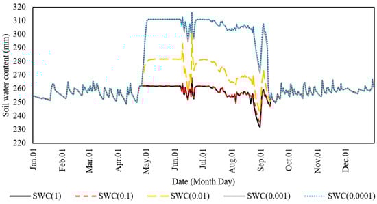 To represent saturated soil conditions in paddy fields, puddling management was added to SWAT-Paddy. To check the model performance and to identify the value of coeffpudd, different values were inputted into the model. Ref. [56] shows that the effect of puddling in terms of coeffpudd is in the range between 5 × 10−10 and 1 × 10−4 for paddy fields in Japan. Among the values of original hydraulic conductivity, the highest value was 85.41 mm/h for the second layer (10–294 mm), and the lowest value was 6.46 mm/h in layers deeper than 466 mm. Figure 7 shows the soil water content simulated with each coefficient value. Soil water content in irrigation periods was observed to increase with a decrease in coefficient, and no significant difference was observed between the simulation results with coeffpudd = 0.001 and coeffpudd = 0.0001. Therefore, the value of 0.0001 was considered extraordinarily low for the model, and the value of 0.001 was used in the case study. Figure 8 shows the fluctuation of degree of saturation in each layer of soil in the paddy HRU with coeffpudd = 0.001. In this study, the plow sole was set in the second layer. Thus, the first and second layers became saturated after puddling. This graph suggests that the puddling was operated successfully in SWAT-Paddy.
