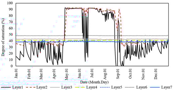 Daily fluctuation in degree of saturation of soil layers in a paddy HRU, in 2012, simulated with SWAT-Paddy.