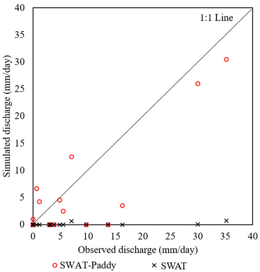 The hydrograph simulated with SWAT-Paddy, compared with the observed river flow, is shown in Figure 11. The accuracy of river flow simulation by SWAT-Paddy (NSE = 0.40 and R2 = 0.51) was lower than that of the original model (NSE = 0.63 and R2 = 0.63). The comparison of Figure 6 and Figure 11 shows that the base flow greatly decreased once the irrigation period had started, which did not occur in the observation. The comparison of the correlations of SWAT and SWAT-Paddy against the observation also reveals the poor model accuracy of SWAT-Paddy for baseflow simulation (Figure 12). The PBIAS calculated for the irrigation period (May to August) and the non-irrigation period (Table 6) showed a trend in which SWAT-Paddy underestimated the river flow in the irrigation period, and overestimated it in the non-irrigation period, more than the SWAT estimates, and the magnitude of bias was almost doubled in SWAT-Paddy. These results suggest that SWAT-Paddy has the problem of poor base flow estimation in this watershed, which is characterized as a lowland paddy field watershed.