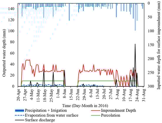 Daily water balance of surface impoundment layer above soil surface in paddy fields in 2016 simulated with SWAT-Paddy.
