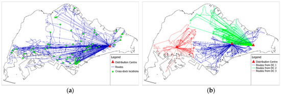 Route creation was performed based on a Vehicle Routing Problem model, implemented in the software XCargo by the company LOCOM GmbH, Karlsruhe, Germany. The software used map data of Singapore to calculate distances and synthetic shipment orders (created for each case using the data obtained from interviews, websites, and background literature) to calculate a set of routes that reduces the overall distance travelled. The number of routes created are determined by service area size and spread, vehicle fleet and number of routes of each vehicle in a day.