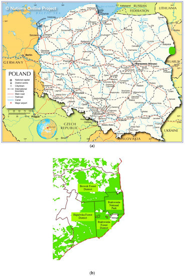 The subject of the research is the Polish managed part of Białowieża Forest. This area consists of three Forest Districts: Białowieża, Browsk, and Hajnówka, located in the north-eastern part of the country (Figure 1).