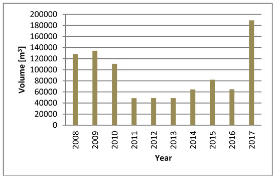 A total of 918,885.26 m3 of wood was harvested from the forest areas managed by the State Forests during the analyzed years (2008–2017), resulting in 99,890 m3 being harvested annually. However, as shown in Figure 2, the harvested volume differed significantly year by year. From 2008–2009, approximately 130,000 m3 of wood was harvested each year. A clearly visible decline was observed for 2009–2011, then the harvested volume was mostly constant until 2013, and then it increased again. This was due to the fact that the Minister of the Environment, taking into account the positions of environmental groups and the Council of Europe, changed the management practices of the forests, limiting timber harvesting from 110,000 m3 in 2010 to 48,500 m3 in the following years.