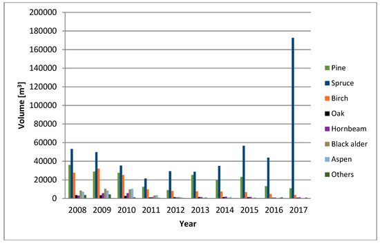 In the analyzed period, the harvesting of broadleaved species was significantly reduced (Figure 4). From 2008–2010, approximately 52,000–66,000 m3 of such timber was harvested. A significant reduction in harvests has been observed since 2011 (20,300 m3), reaching a level of 6900 m3 in 2017. Birch was primarily harvested, constituting 46 to 60% of the broadleaved species, depending on the year. The trends in harvesting other species have also changed. The percentage share of oak and hornbeam wood increased from around 5 to 13% and 16%, respectively; an opposite trend was observed for aspen, and especially for black alder, for which harvesting was almost halted. In 2017, only 172 m3 of this species were extracted.