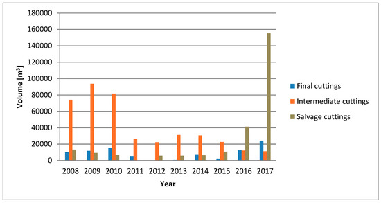 From 2008–2015, wood was harvested in the analyzed area mainly by intermediate cuttings (Figure 5), for the purpose of improving stand development. Salvage cuttings have been mainly used in the last two years, especially in spruce stands.