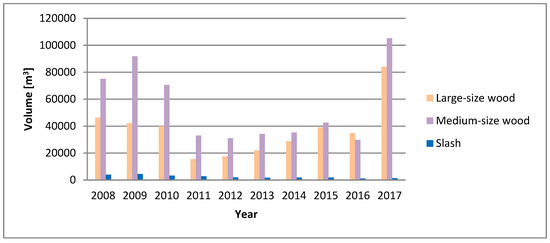 When analyzing the volume of harvested medium-size timber (Figure 8), the share of the S2 wood category intended for industrial purposes (industrial stacked wood) was clearly visible. It ranged from 21,287 m3 (77.9%) in 2011 to 89,824 m3 (85.4%) in 2017, with fuel wood (S4) making up the rest to 100%. The quality of this assortment was not suitable for industrial production due to its defects. It was primarily intended for heating purposes, therefore it was sold to the local community.