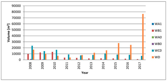Until 2007, the majority of infested trees were removed as part of sanitation procedures. After this period, however, a large number of spruce snags were left in the area, contributing to a significant increase of trees infested by this insect. In 2016, the volume of such trees in BF exceeded 480,000 m3 of wood [5]. In the same year, the Minister of the Environment decided to increase harvests in the analyzed Forest Districts, which is clearly illustrated in Figure 9. This was mainly dictated by the need to improve public and fire safety. The harvested wood was of much worse quality, compared to the wood obtained in previous years.