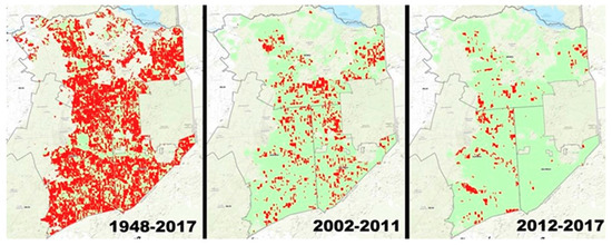Most of BF has been shaped by people for centuries. Fragments of natural forests occupy about 20% of its area and no forestry work is performed in those areas. The rest of the forest is multifunctional, where the greatest emphasis is placed on nature conservation. In the past, foresters’ activities were conducted in those fragments planted by humans, where forest management activities have been conducted for years or which should be transformed, so that the stand structure better suits the conditions of a given area. Figure 9 illustrates the scope of total cuts conducted in the analyzed Forest Districts, covering the 1948–2017 period. All areas where work was conducted are marked in red. The total share of these areas is significant. At the same time, the significant decrease in the number of harvesting sites is clearly visible [30].