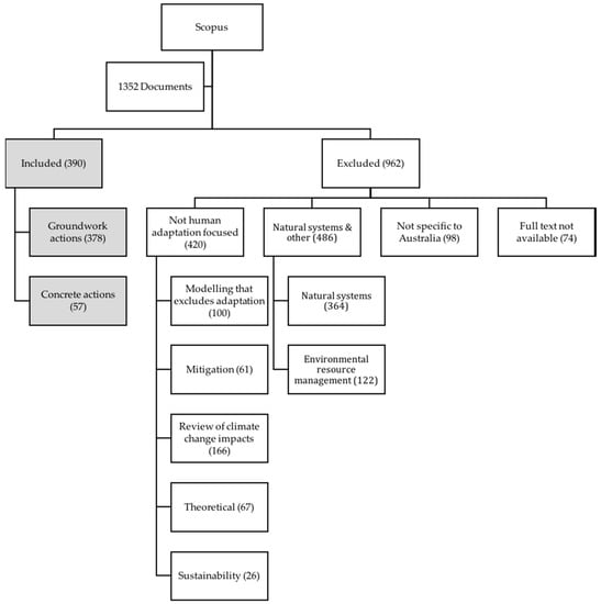 A document search was performed in the Scopus database using the terms “Adapt*” AND “Climat* Change” AND “Australia*” in the title, keywords, and abstract fields. Scopus was selected due to its availability as one of the most current, powerful, comprehensive and widely used search engines for peer-reviewed literature [23]. The search focused on peer-reviewed literature reporting or discussing intentional human adaptation initiatives in Australia published between January 2005 and January 2018, reflecting the goal of characterizing how the peer-reviewed literature depicts how climate change adaptation is occurring in Australia. The search retrieved 1352 articles (Figure 1). Articles that discuss both groundwork and concrete adaptation actions are included in both categories and excluded documents can be grouped in multiple categories in Figure 1. An inclusion/exclusion process was applied to the retrieved literature (Table 1). Every article was examined and the abstract was read to ensure that the article dealt with intentional human adaptation to climate change in Australia, and eliminate duplicate records, articles that were not peer-reviewed, in languages other than English, and those to which full text was not available.