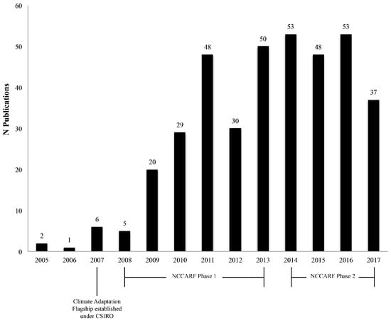 Reporting on adaptation in Australia in the peer-reviewed literature has increased over the past 10 years, consistent with trends observed in other countries [24]. In particular, there was a sharp increase in adaptation reporting observed from 2009 onwards, which may partially be explained by the establishment of the NCCARF in 2008 and the publication of project findings that followed (Figure 2). There is a notable decrease in the number of publications in 2012 compared with 2011 but still higher than 2005–2010. The increase between 2009 and 2014 is followed by a peak and plateau from 2014 onwards, and slight dip in 2017.