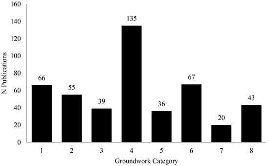Reported adaptation initiatives are primarily composed of groundwork actions. Of the 390 documents included, 85% (n = 333) report on groundwork actions alone, 12% (n = 45) report on both groundwork and concrete actions, and only 3% (n = 12) report on concrete actions alone. This finding is consistent with the dominant federal government narrative that climate change adaptation has focused on strengthening the science of climate change and addressing knowledge gaps in order to provide the foundations for effective adaptation policies and actions [3]. All eight of the groundwork categories are represented in reported groundwork actions, but there is a particular focus on understanding stakeholder perspectives about climate change and attitudes towards adaptation (Category 4), scenario planning or modelling with an adaptation focus (Category 6), and impact, risk, vulnerability and adaptive capacity assessments (Category 1) (Figure 3).
