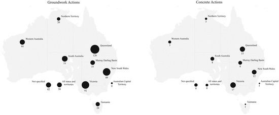 Geographic distribution of groundwork and concrete adaptation actions across Australia.