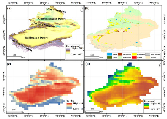 Xinjiang Uyghur Autonomous Region, extending between 73°40′–96°23′ E and 34°25′–49°10′ N and covering an area of about 1.6 million km2, is the largest province-level region in China (Figure 1). Surrounded by three mountains—Altay, Tianshan, and Kunlun, from north to south—the thermodynamic contributions are largely independent of atmospheric circulation. Additionally, two vast deserts lie between the mountains—Taklimakan desert, located in Tarim Basin, and Gurbantunggut Desert, located in Junggar Basin (Figure 1a). Approximately 62% of Xinjiang’s total area is covered by deserts with a low percentage (~9%) of desert vegetation coverage, and is dominated primarily by shrubs (e.g., Haloxylon ammodendron and Tamarix ramosissima) [28] and cropland (4.3%) (Figure 1b). The altitude ranges from less than −157 m in Taklimakan desert to more than 7015 m in Kunlun Mountain (Figure 1a). Located in the hinterland of the Eurasian continent, and far away from the ocean, Xinjiang is one of the driest regions in the world, and is characterized by typical continental climate with mean annual temperature varying from −11 °C within the Kunlun Mountains to 16 °C within Taklimakan Desert (Figure 1c), and mean annual precipitation less than 50 mm/year in Taklimakan Desert and more than 400 mm/year in the Altay and Tianshan Mountains (Figure 1d).