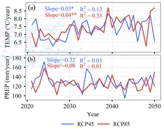 Temporal changes in temperature (a) and precipitation (b) during 2021–2050 under Representative Concentration Pathways (RCP4.5) and RCP8.5 scenarios (* p < 0.1, ** p < 0.05).