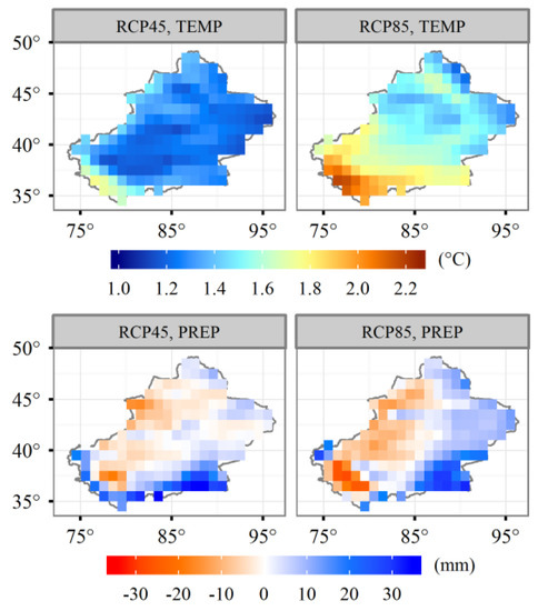 It is common to find that the GCM data could better simulate temperature than precipitation, particularly in the spatial distributions. Moreover, the GCM projected temperature indicated steadier increasing trends than precipitation. The simulated largest deviation from precipitation always appears in a region with greatly undulating terrain (e.g., Tianshan, Pamir, and Karakoram Mountain regions of Xinjiang) [43]. With the sparse distribution of meteorological stations in the high mountains, the limited interpolation of climate factor might cause uncertainty in spatial and temporal climate change, especially for precipitation. Regarding precipitation, the spatial and temporal variabilities are mainly dependent on meteorological and topographic factors [43]. Such great biases for different GCM scenarios would be major limitations of this study. The appropriate downscaling methods are important for a simulation of climate variables, which should be applied in the next study. In order to effectively minimize uncertainty related to the selection of the climate model, there are many downscaling GCM technologies. For example, Luo et al. [42] used downscaling approaches based on the median of ensemble GCMs to reduce uncertainty in Xinjiang; Su et al. [44] used a dynamic downscaling technology to minimize uncertainty in the Tarim River basin of Xinjiang. Combining GCMs with remote sensing data would also be an effective method for local climate change research.