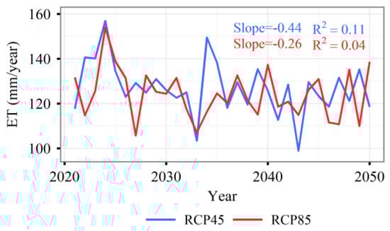 Temporal variations in evapotranspiration during 2021–2050 under RCP4.5 and RCP8.5 scenarios.