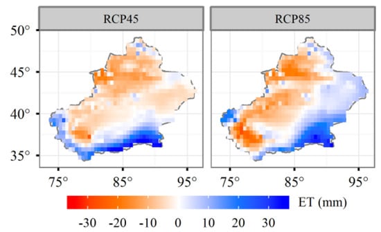 The spatial pattern changes of evapotranspiration are shown in Figure 6, which is similar with the patterns of changes in precipitation. Opposite signs of difference values occurred under both scenarios; positive values appeared in the eastern and southern areas and negative values occurred in the western area. In the central region of Xinjiang, evapotranspiration showed less variability than the other regions.