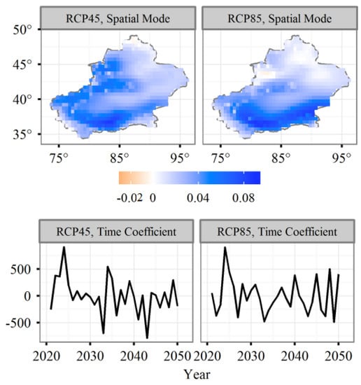 In order to further investigate the spatially coherent patterns of temporal variations of regional evapotranspiration, the first EOF spatial mode and corresponding time coefficients was analyzed (Figure 7). Under the RCP4.5 scenario, the first EOF spatial mode represents 36.1% of total variance in evapotranspiration, and almost the entire region showed positive values, which indicates a uniform variation. It should be noted that higher positive values occurred in Tianshan and Kunlun Mountains areas, implying that evapotranspiration varied more significantly in these high-altitude areas. In Figure 3, the time coefficients showed a large inter-annual variability, demonstrating a high comparability with the temporal changes of annual mean evapotranspiration. The first EOF spatial mode for RCP4.5 was comparable with that for RCP8.5, which explains about 36.4% of total variance in evapotranspiration. Similarly, relatively strong variations occurred in the Tianshan and Kunlun Mountain areas and weak positive areas were distributed in the Taklimakan desert and Gurbantunggut desert areas. The corresponding time coefficients also showed a strong inter-annual evapotranspiration variation during the period of 2021–2050.