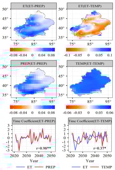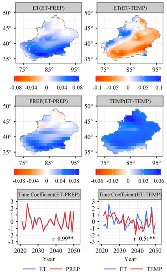 In this section, SVD analysis is used to examine inter-annual variations of evapotranspiration linked to changes in temperature and precipitation during 2021–2050. Figure 8 shows the spatial structures and corresponding time coefficients of the first paired modes of evapotranspiration-precipitation and evapotranspiration-temperature under the RCP4.5 scenario. The first spatial mode of evapotranspiration-precipitation explains about 74.2% of the total squared covariance between the two fields, with a correlation of 0.98 between the two time series of coefficients. The spatial patterns of evapotranspiration fields were characterized by high positive values in the Tianshan and Kunlun Mountain areas and small values in the Taklimakan desert and Gurbantunggut desert, which is similar to the corresponding precipitation fields. The strong relationship of covariance between evapotranspiration and precipitation indicates that more precipitation will yield more evapotranspiration. The first paired spatial mode of evapotranspiration-temperature under RCP4.5 explained 67.9% of covariability, with a correlation of 0.37 between two time series of coefficients. The evapotranspiration patterns showed an obvious separation that positive evapotranspiration anomalies were found in southeastern areas and negative evapotranspiration anomalies were mainly distributed in northwestern Xinjiang. For the temperature fields, almost the entire region showed positive anomalies, which indicates a uniform variation for the temperature. The features of evapotranspiration and temperature for the first mode revealed that the higher temperature will give rise to a reduction of evapotranspiration in southeastern parts of Xinjiang in the future period of 2021–2050.
