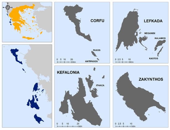 The study area encompassed the region of the Ionian Islands, which is located in Western Greece (Figure 1). In terms of administrative boundaries, the region consists of four prefectures each of which contain a main Island and some islets. The region covers an area of 2278 km2, wherein Corfu, Lefkada, Kefalonia, and Zakynthos cover 640, 355, 878, and 405 km2, respectively. These Islands are characterized by high relief landscapes, with elevations reaching up to 1630 m. The local climate is Mediterranean, consisting of mild–humid winters and warm–dry summers. The geology mainly consists of limestone, except for Corfu, which is dominated by Neogene formations and Quaternary deposits [39]. The primary vegetation is characterized by pine forests, olive groves, and other vegetation types, such as transitional and sparse vegetation [40]. The Ionian Islands encompass 14 protected areas under the Natura 2000 Network with natural characteristics and ecological features, such as the presence of nesting habitat for the loggerhead sea turtle Caretta caretta [41]. Tourism is one of the most important sectors sustaining the economy of this region [42,43,44,45].