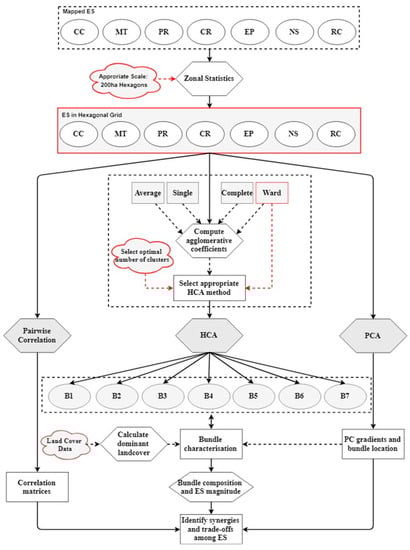 Methodological flow chart used to identify interactions among ecosystem services (CC: cultivated crops; MT: materials from timber; PR: plant-based resources, CR: climate regulation, EP: erosion prevention; NS: Nursery; RC: recreation; HCA: hierarchical cluster analysis; PCA: principal component analysis; B1–7: ES bundles).