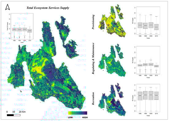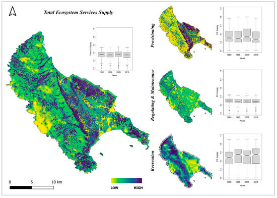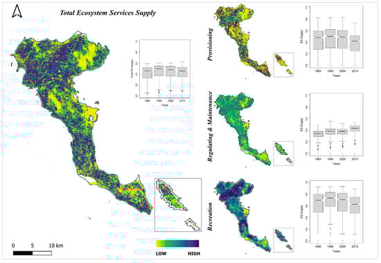 The spatial distribution of ES in three islands (Corfu, Lefkada, and Kefalonia) followed a similar spatial pattern, where provisioning ES, regulating and maintenance ES, and recreation were spatially co-occurring. This finding contrasted with that of Queiroz et al. [13], who found substantial differences in the distribution of provisioning, regulating, and cultural ES. On Zakynthos only, provisioning ES was distributed differently in relation to the other two ES groups, supporting a study conducted to an Alpine-wide level [99], in which provisioning ES was found to be clustered in different areas to those where regulating and cultural ES occur. All three ES groups exhibited significant differences in their temporal variation over time in Corfu only, whereas provisioning ES and recreation followed a similar decreasing trend and regulating services increased. These results might be due to the loss of forests and high-density olives [40]. As expected, areas of high naturalness provided high ES supply, supporting the results of previous studies [100,101,102,103], and contrasted with the lower values obtained in rocky and poorly vegetated areas.