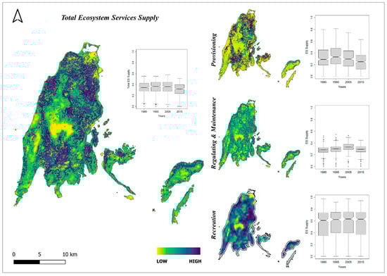 Raudsepp-Hearne et al. [10] first introduced the concept of identifying interactions among ES by analyzing the spatial pattern of ES bundles, with this concept being subsequently implemented by many researchers [9,13,14]. An ES bundle refers to a set of interacting (positively or negatively) ES that repeatedly occur across a spatial and temporal scale [8]. Renard [11] used the ES bundle approach to explore the importance of historical dynamics (35-year dataset) in a mixed-use landscape to identify processes and drivers behind the changing relationships among ES. Tomscha and Gergel [12] also demonstrated the importance of monitoring long-term interactions among ES to manage heterogeneous landscapes. In order to avoid future impacts on the provision of benefits to society, it is inevitable to identify possible conflicts among ecosystem services across space and time [11,12,15]. For example, Sutherland et al. [16] showed the utility of monitoring the long-term recovery of ES from timber harvest to maintain multifunctional forests. Furthermore, Koch et al. [17] showed that a lack of information on the temporal and spatial variability of coastal characteristics generates additional management problems when protecting coastal areas. Despite there being a wealth of literature mapping and quantifying the interactions of ES, a recent literature review [18] showed that few studies have investigated the ES bundles of island ecosystems, which is important to identify management practices optimizing or negatively affecting the potential of island landscapes to supply ES.