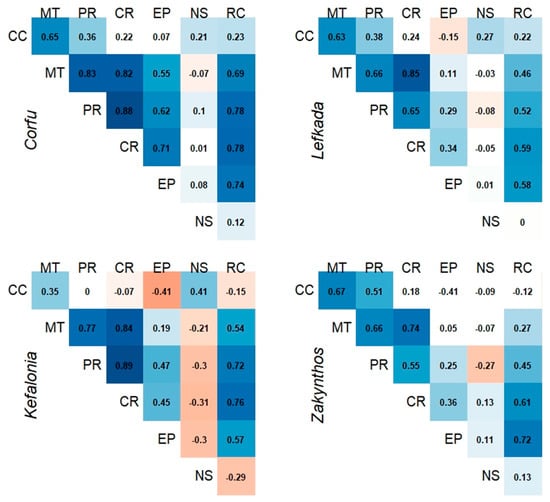 Among provisioning ES (CC, MT, and PR), there were mainly strong and moderate positive correlations, especially in Zakynthos where all correlations were higher than 0.50. Only in Kefalonia, certain ES pairs (CC-MT and CC-PR) presented moderate and weak synergies (r < 0.35).